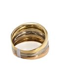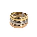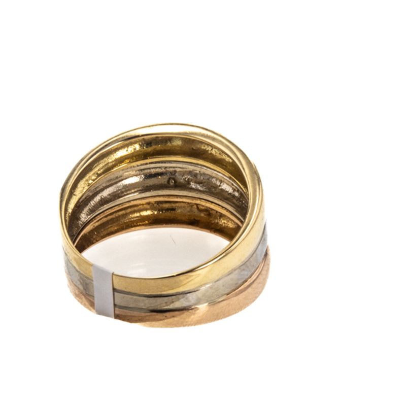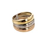 Este elegante y sofisticado anillo de 18K en tres tonos es la joya perfecta para complementar tu look. Su diseño único y exclusivo lo convierte en el accesorio ideal para cualquier ocasión. Atrévete a lucir esta pieza de lujo y resalta tu estilo con un toque de elegancia.
