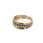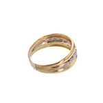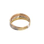 Este elegante anillo de 3 tonos en oro de 18K es el complemento perfecto para resaltar tu estilo y sofisticación. Diseñado con un detalle único y brillante que sin duda captará todas las miradas.
