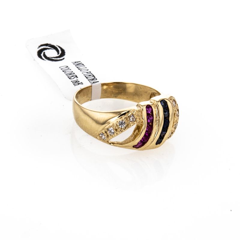 Descubre la elegancia y sofisticación de nuestro anillo de oro 18K con piedras de colores brillantes. Un accesorio único y llamativo que complementará cualquier outfit con un toque de lujo y estilo.
