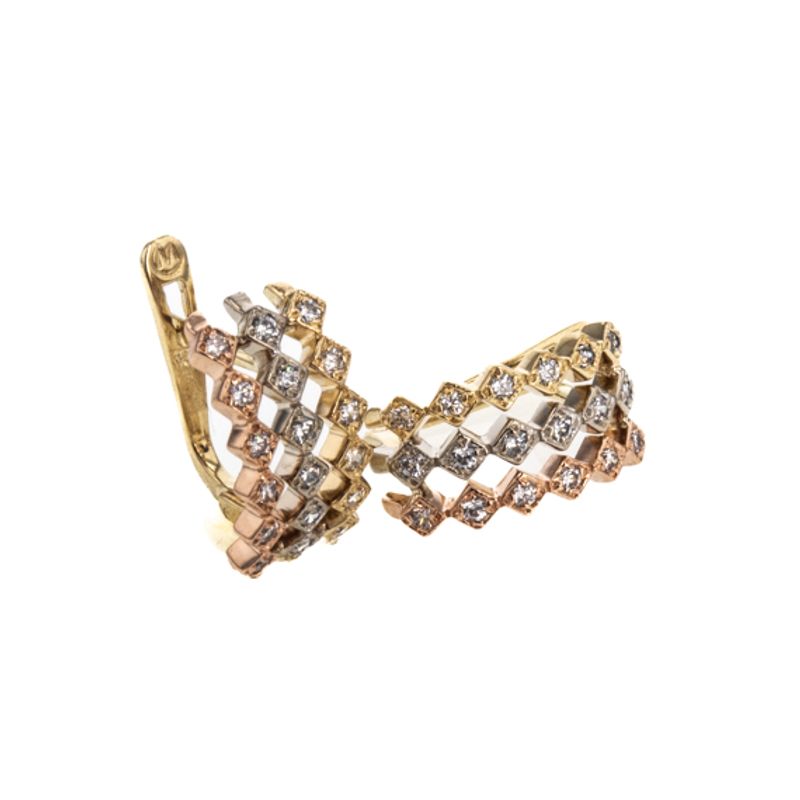 Impresiona con estos elegantes aretes cortos con tres tonos de oro y brillantes zircones de 18K. Un accesorio perfecto para complementar cualquier outfit y resaltar tu estilo único.