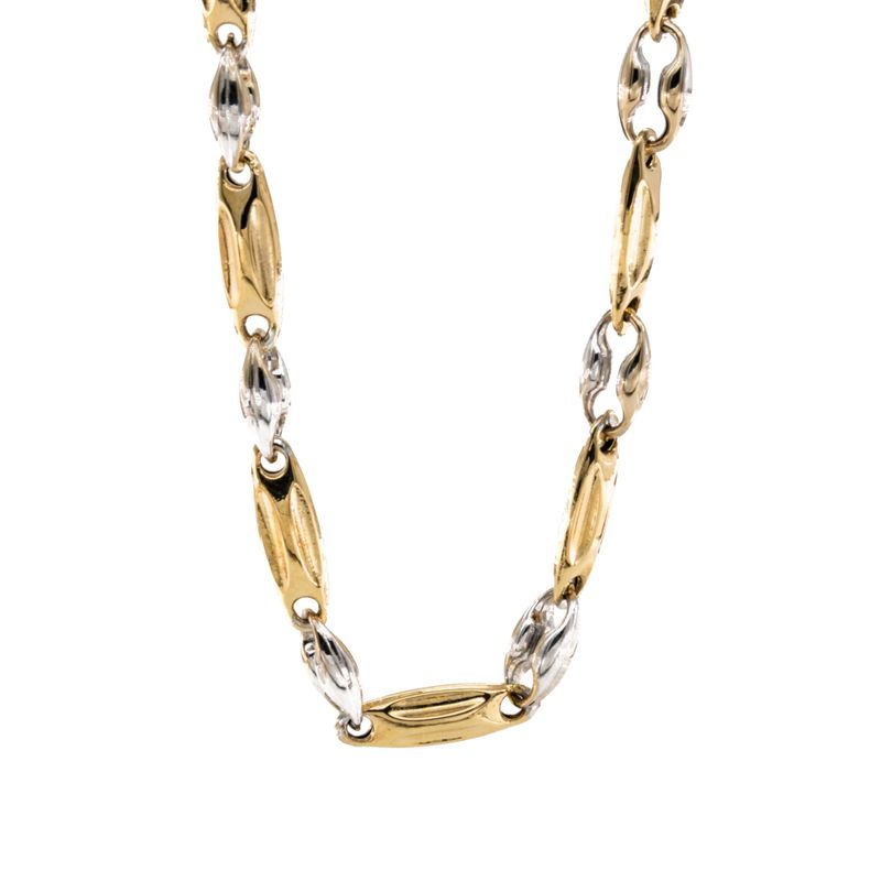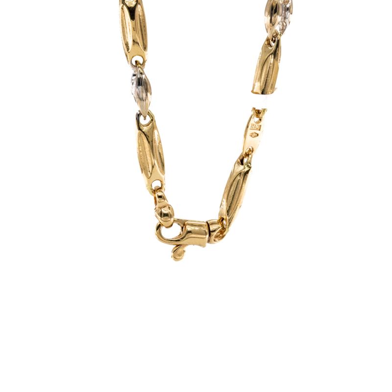 Descubre la elegancia y sofisticación de esta cadena de dos tonos en oro de 18K. Su diseño versátil y atemporal la convierte en el complemento perfecto para cualquier ocasión.