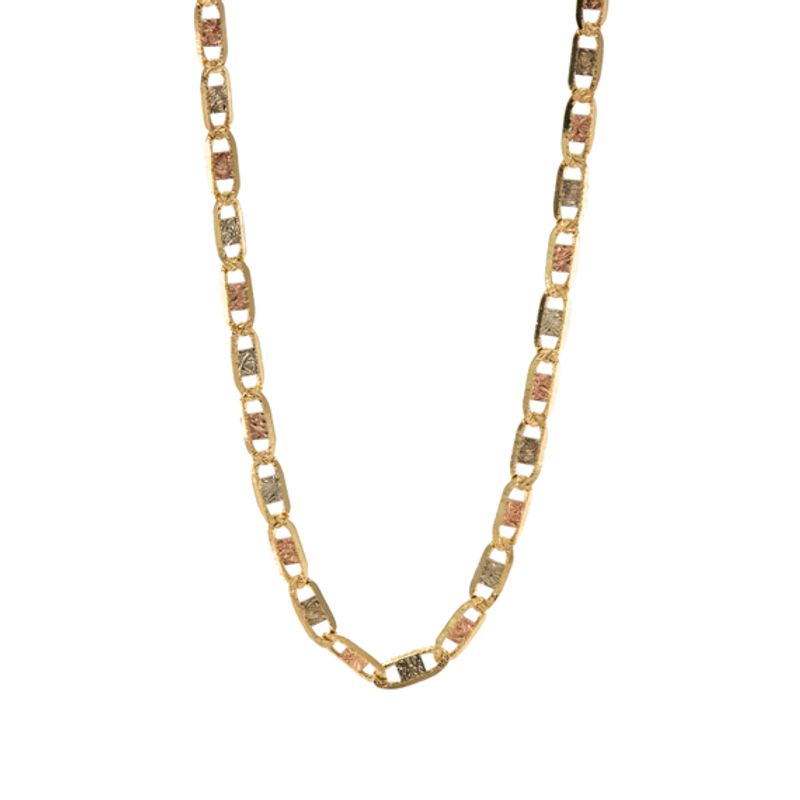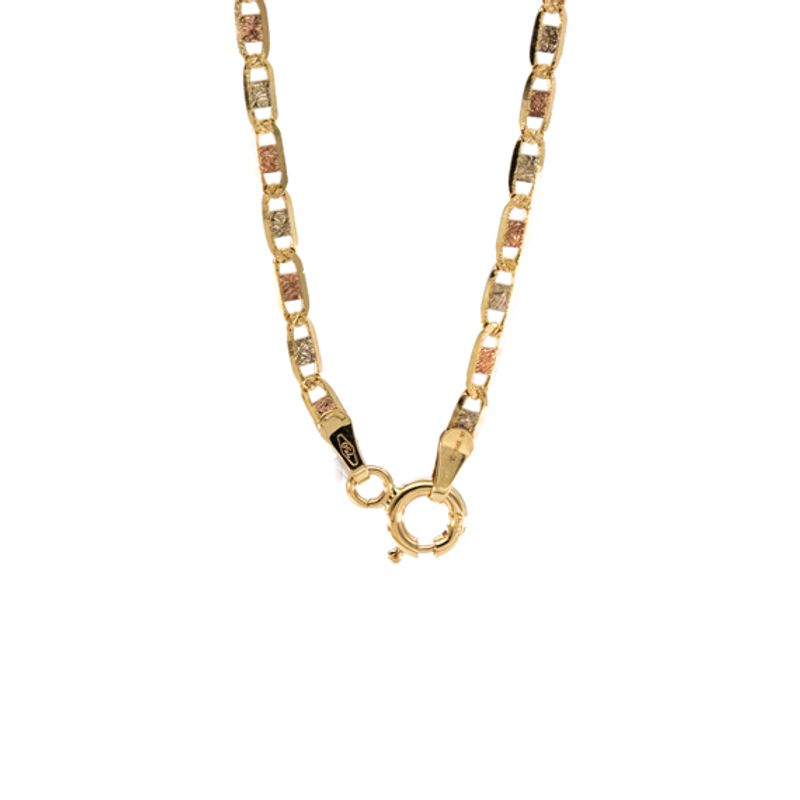 Esta elegante cadena ancla de oro de 18K combina tres tonos para un diseño moderno y sofisticado que complementará cualquier outfit. Una pieza imprescindible en tu colección de joyas.