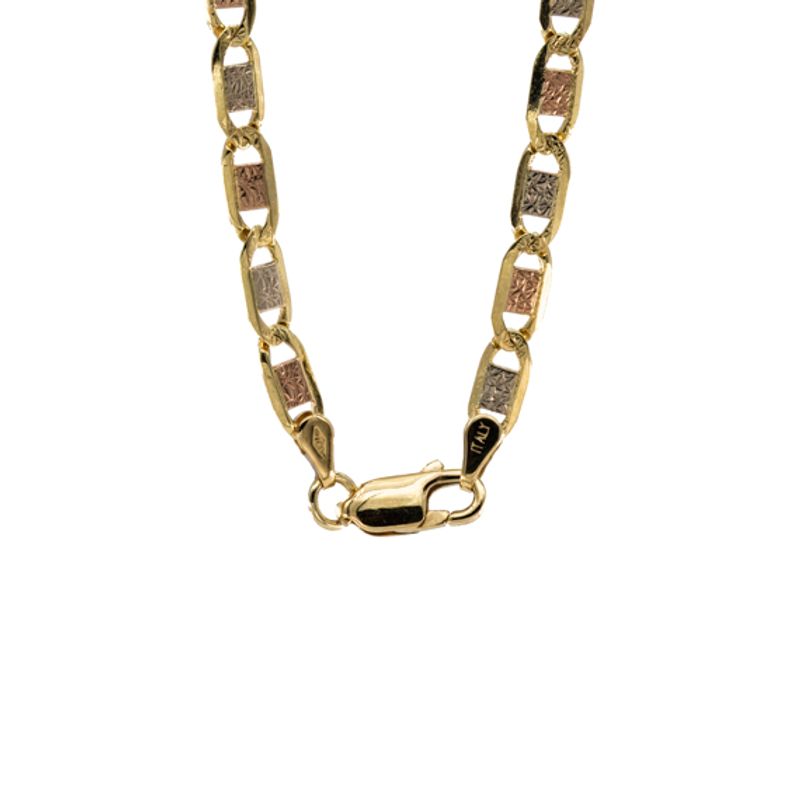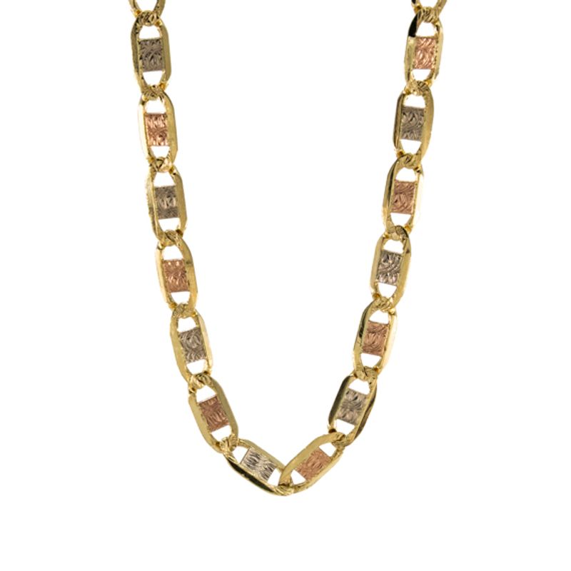 Un diseño sofisticado y elegante para tu estilo único. Nuestra cadena ancla de 3 tonos de oro de 18 quilates es la pieza perfecta para resaltar tu belleza y distinción. Hecha con los más altos estándares de calidad, esta joya te acompañará en todas tus ocasiones especiales.
