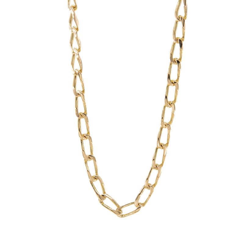 Encuentra la elegancia y sofisticación en la cadena Bilbao de 18K, un accesorio de alta calidad que realzará tu estilo en cualquier ocasión. Su diseño clásico y atemporal la convierte en la pieza perfecta para complementar tu look.