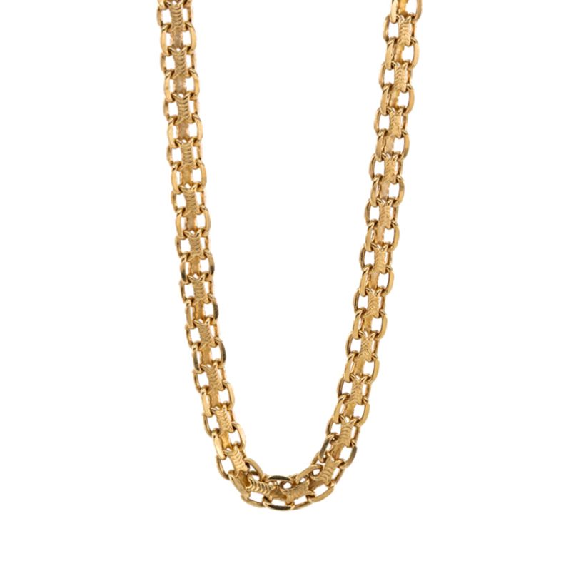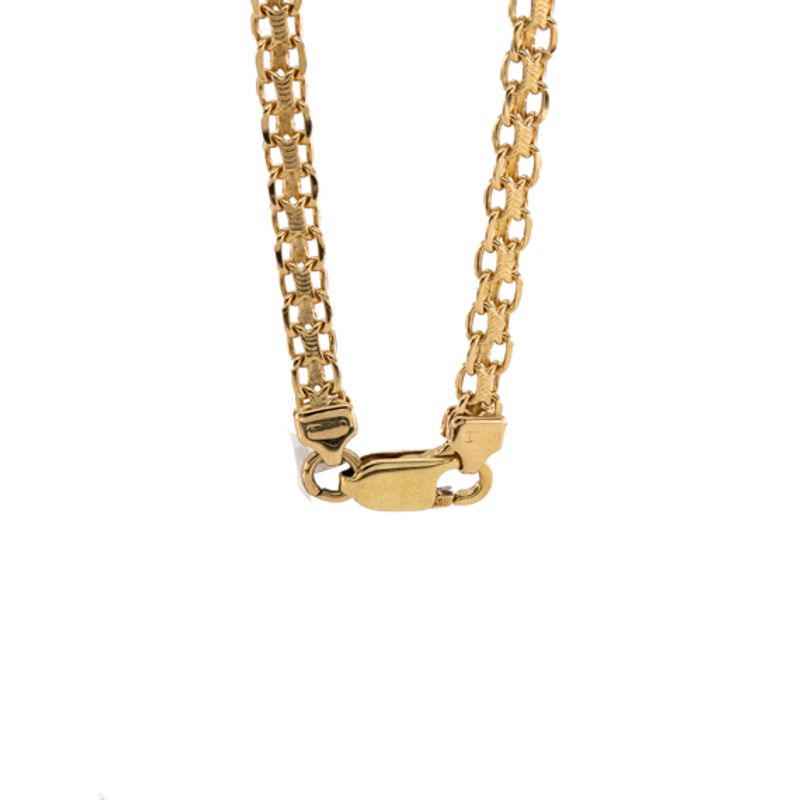 Obtén un look elegante y sofisticado con nuestra exclusiva cadena Bismark de oro 18K. Con un diseño único y llamativo, esta joya es el complemento perfecto para cualquier ocasión. Hazte con la tuya y destaca con estilo y distinción.