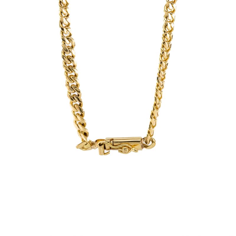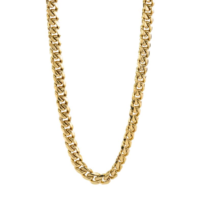 Impresiona a todos con esta imponente cadena cubana de 18K, un elegante accesorio que realzará tu estilo y te hará brillar en cualquier ocasión. Hecha con los más altos estándares de calidad, esta cadena es un verdadero tesoro que perdurará en el tiempo.