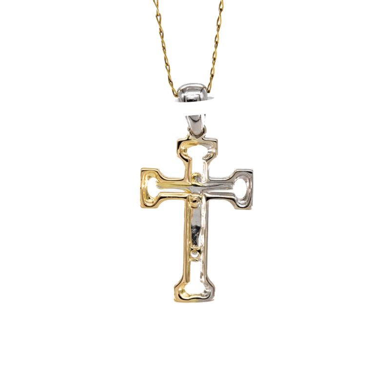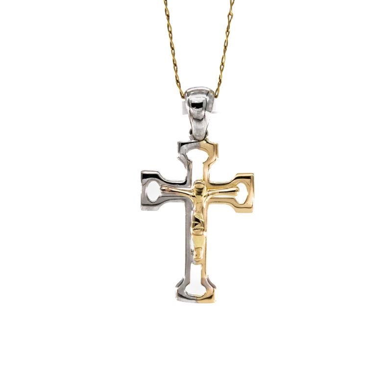 Resplandece con nuestro dije crucifijo de 2 tonos en oro de 18K. Un diseño elegante y sofisticado que realzará tu estilo con un toque divino. Perfecto para lucir en cualquier ocasión.