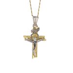 Este hermoso dije crucifijo de dos tonos con zircones en oro de 18K es la pieza perfecta para agregar un toque elegante y sofisticado a tu outfit. El diseño clásico y el brillo de los zircones lo convierten en una joya única y atemporal que sin duda llamará la atención.