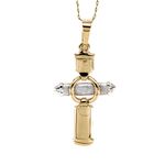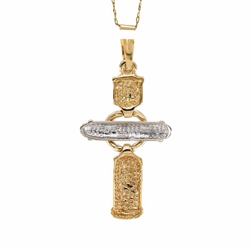 Luce elegante y sofisticada con nuestro dije Cruz 2 tonos de 18K, un accesorio perfecto para realzar tu estilo y añadir un toque de lujo a tus outfits diarios.