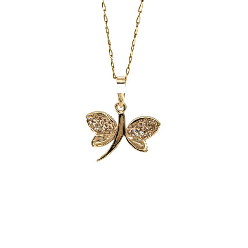 Resalta tu estilo con este elegante dije de libélula con zircones en oro de 18 quilates. Su diseño delicado y brillante te hará lucir radiante en cualquier ocasión.