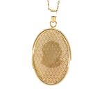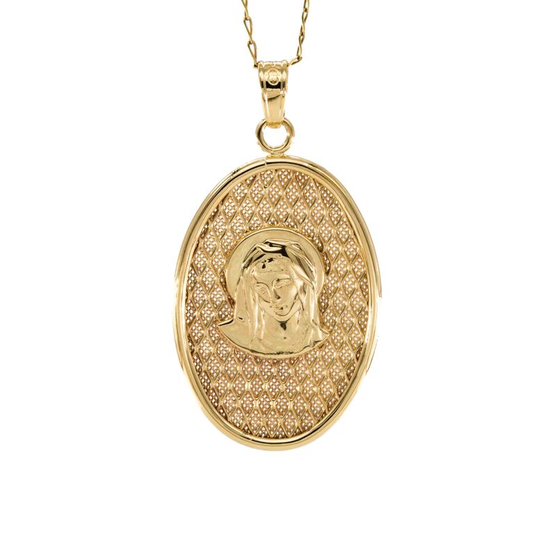 Este elegante dije ovalado de oro de 18 quilates es una hermosa pieza que destaca por su delicado diseño y la imagen de la virgen tallada con detalle. Aporta un toque de distinción a cualquier atuendo.