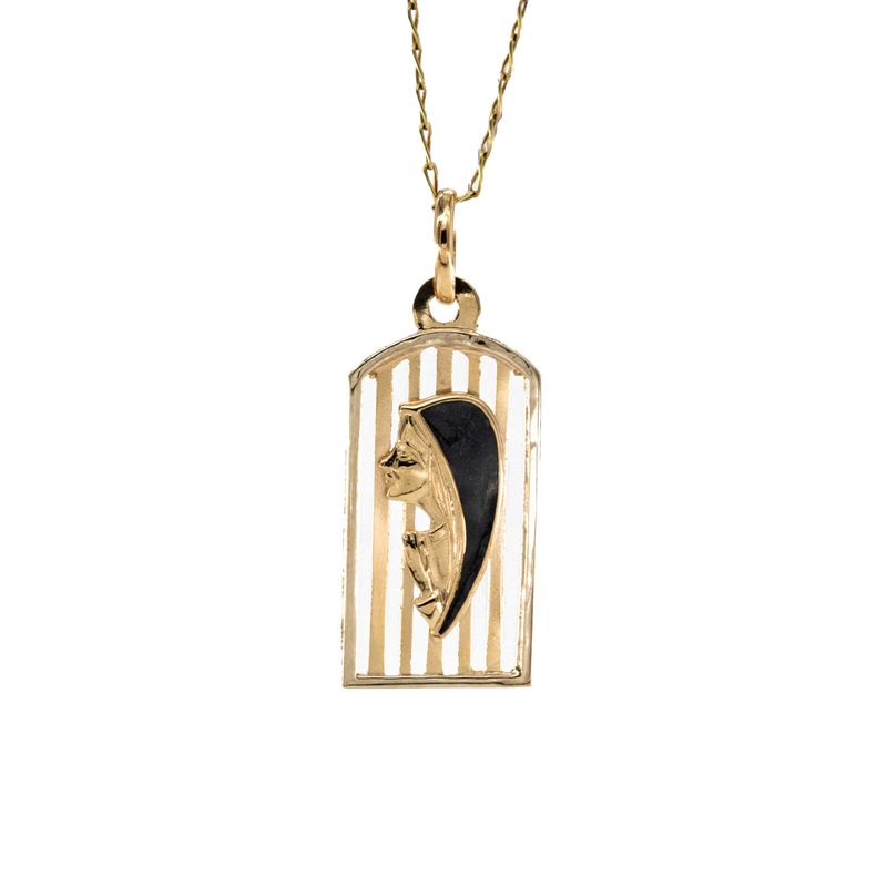 Este exquisito dije de placa Virgen en oro de 18k es el complemento perfecto para resaltar tu elegancia y fe en cualquier ocasión. Su diseño delicado y sofisticado lo convierte en una joya única y versátil que no puede faltar en tu colección.