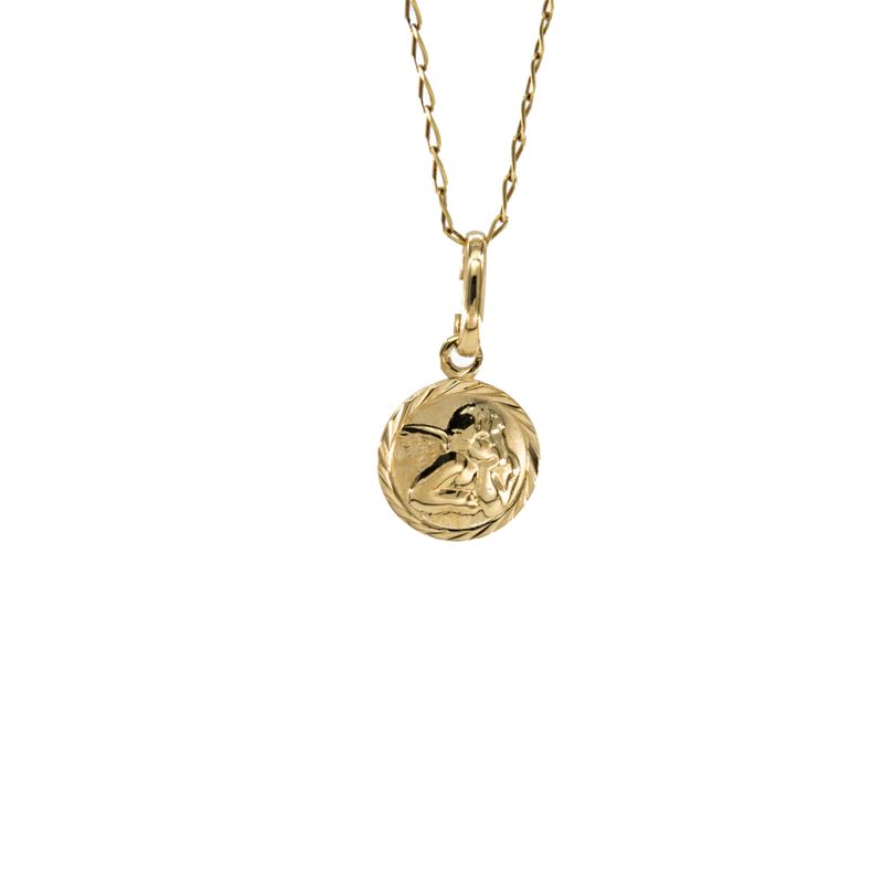 Este hermoso dije redondo de ángel en oro de 18 quilates es el complemento perfecto para tu colección de joyas, con un diseño elegante y detallado que aportará un toque de brillo a cualquier atuendo.