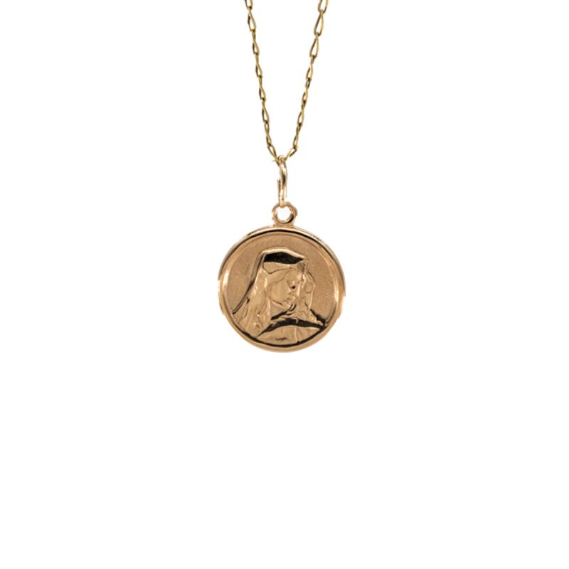 Eleva tu estilo con este elegante dije redondo de Virgen en oro de 18 quilates. La belleza y la delicadeza de la pieza harán resaltar tu outfit en cualquier ocasión.