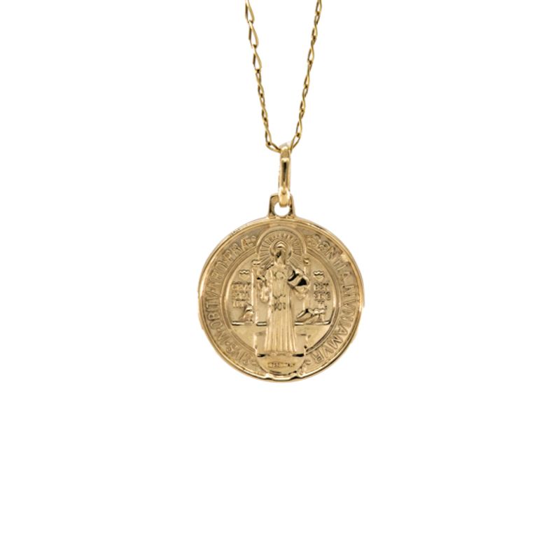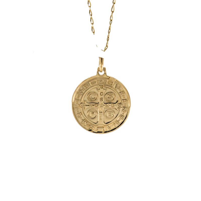 Lleva contigo toda la protección y elegancia con nuestro dije San Benito de oro 18K. Con un diseño exquisito y calidad inigualable, esta pieza es el complemento perfecto para realzar tu estilo único.