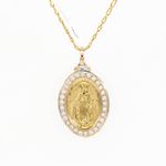 Este exquisito dije de Virgen está elaborado en oro de 18k con acabado en dos tonos y preciosas piedras incrustadas, un accesorio único que complementará tu look con elegancia y estilo.