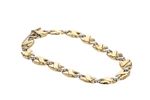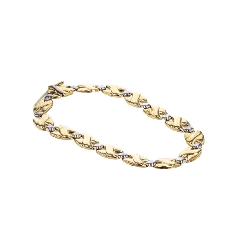 Descubre la elegancia y distinción con nuestra pulsera de 2 tonos en oro de 18 quilates. Un diseño exclusivo que combina la suavidad del oro blanco con el brillo único del oro amarillo, perfecta para realzar tu estilo en cualquier ocasión.