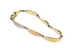 Eleva tu estilo con esta exquisita pulsera de tres tonos de oro de 18 quilates. Su diseño único y elegante la convierte en el complemento perfecto para cualquier ocasión.