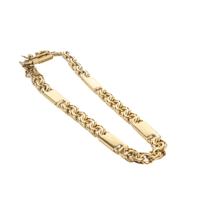 Confeccionada con oro de 18k, la pulsera chino con placas es la combinación perfecta entre elegancia y sofisticación. Ideal para cualquier ocasión, esta joya única se convertirá en el complemento perfecto para tu look.
